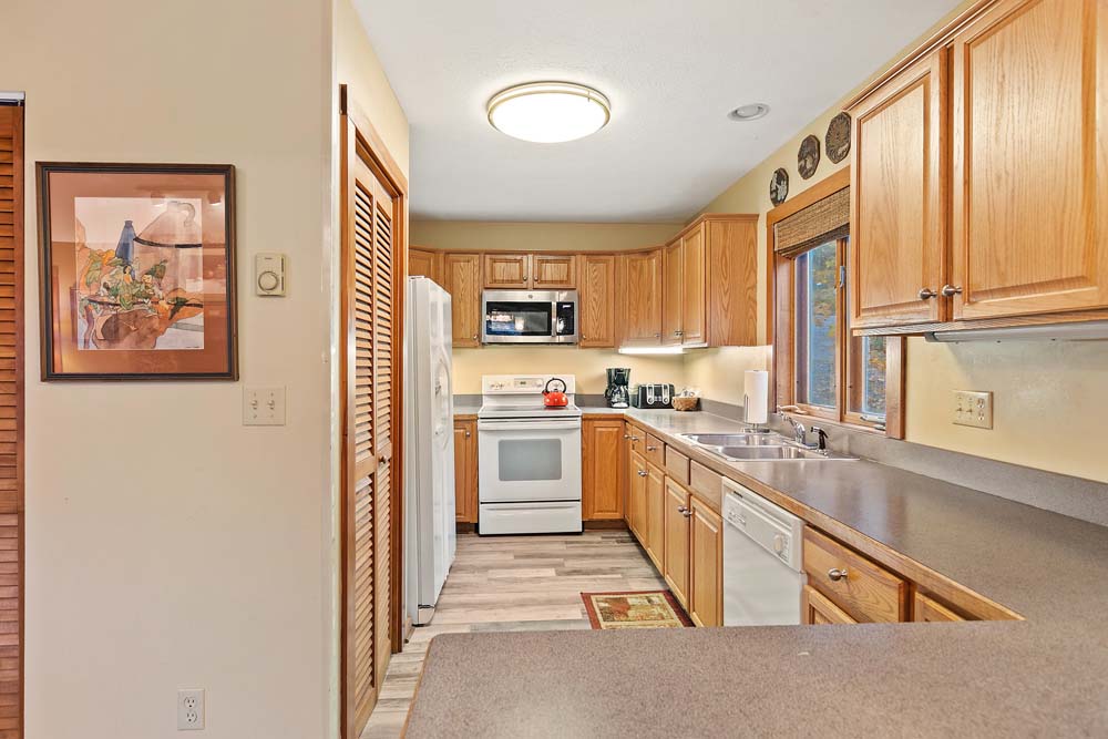 The main level has a carpeted open floor plan featuring vaulted ceiling with a full kitchen, dining area to seat six, a half bath and a laundry area. The living room has a cozy feel to it with comfortable furniture, flat panel television and gas fireplace.