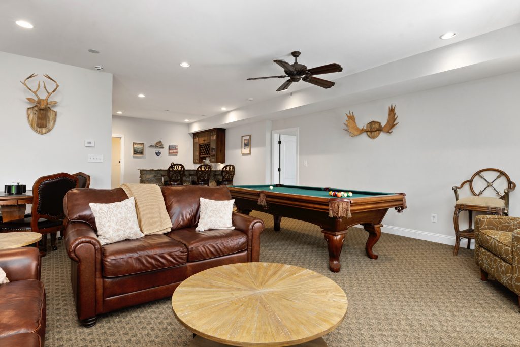 Lower level includes a second gas fireplace and a living area with two leather sofas and two chairs. Pool table, poker/ game table, dart board, large TV, and family games make this room a favorite hangout spot. Stone bar is equipped with a wine fridge, sink, stemware, and 3 barstools. Lower level also includes a bedroom with two twin beds and a full bathroom with a walk-in shower. Washer and dryer are located on the lower level. Large deck off the lower level with valley views.