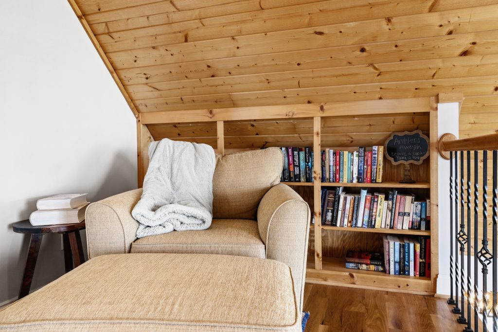 Upper level includes a reading nook with a chair and ottoman. Two bedrooms with Queen beds and 2 closets and a full bathroom.